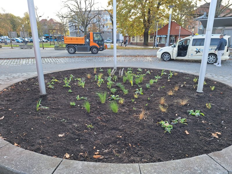 Mitarbeiterinnen und Mitarbeiter des Baubetriebshofes der Barlachstadt Güstrow haben in dieser Woche den Kreisel am Taxistand des Bahnhofes umgestaltet. Dabei wurden über 100 insektenfreundliche Stauden gepflanzt sowie mehrere hundert Narzissen- und Tulpenzwiebeln gesteckt. Ab März werden die ersten Narzissen blühen, welche dann im April durch die Tulpen farblich unterstützt werden. Danach prägen die Stauden mit ihren Blüten bis in den Oktober das Erscheinungsbild des Beetes. Bedeckt wurde die Fläche mit einer mineralischen Mulchschicht, um den Wildkrautwuchs zu hemmen und die Verdunstung im Sommer zu reduzieren.