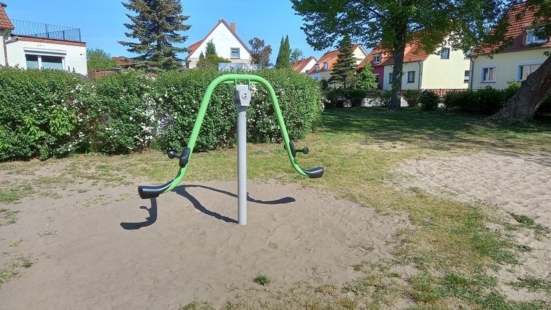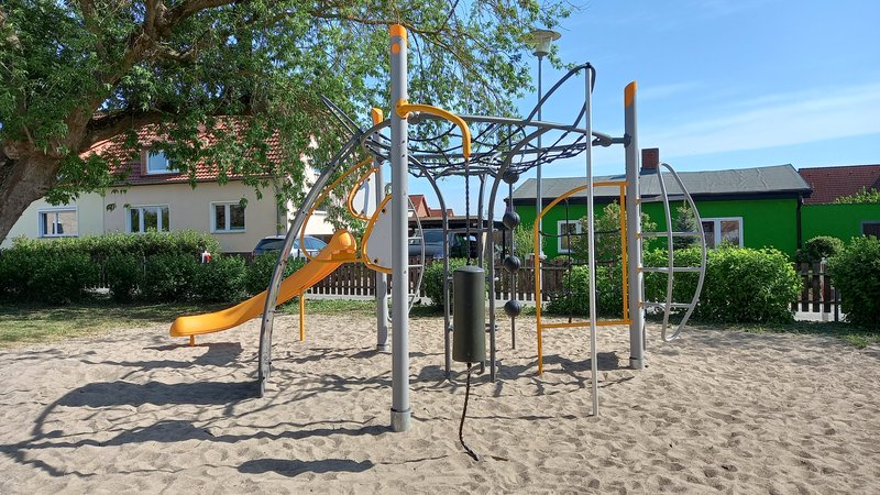 Ausstattung: Doppelschaukel mit einem Doppelschaukelsitz für zwei Personen (auch für Kleinkinder geeignet), Spiel- und Klettergerät mit einer etwas anderen Rutsche, Schaukel-Wippe für zwei Personen, Sandkiste, Laufrolle, Reifen-Parcours, Doppelwipper